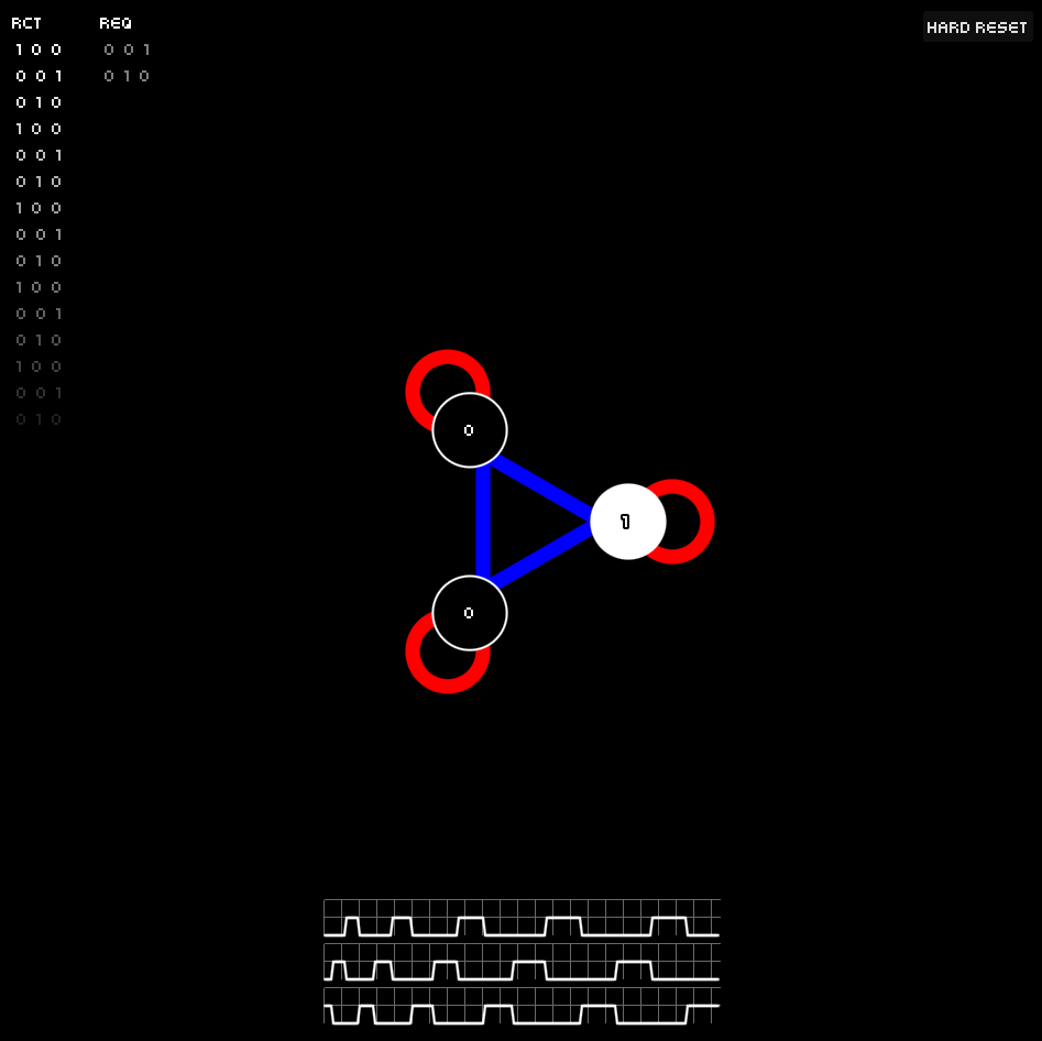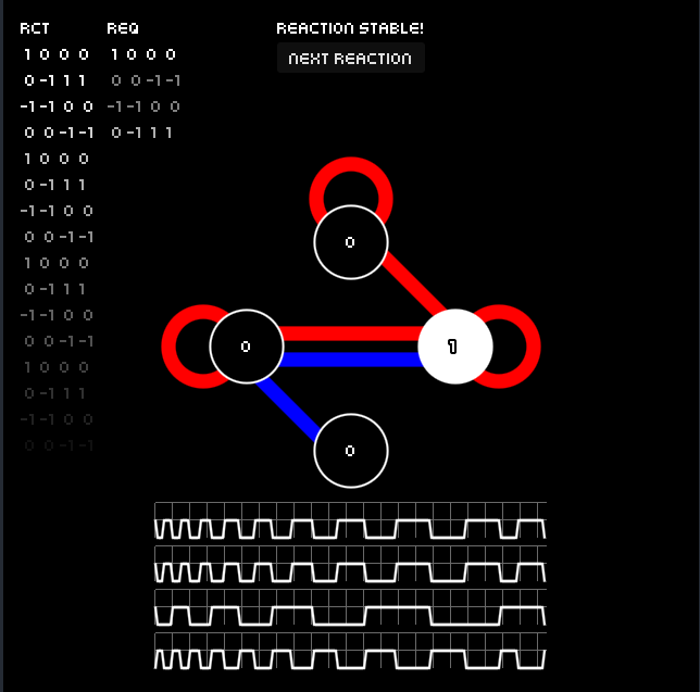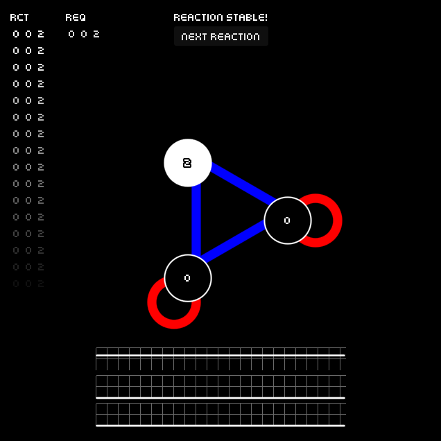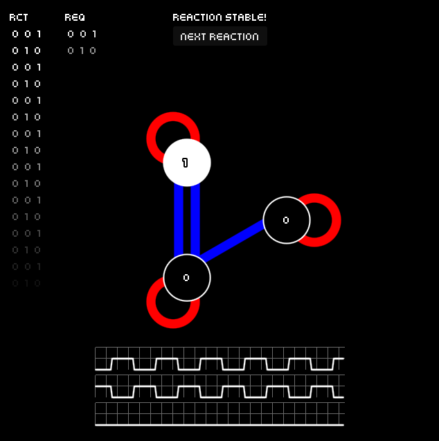 An esoteric finite-state-machine puzzler. Adjacent atoms impart their states on each other additively, can you find a stable pattern that matches the target?